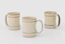 Oatmeal glaze with three lines of iron brush decoration and iron brush decoration on handle.