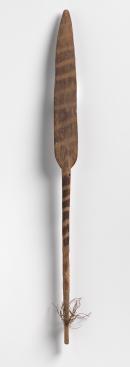 Long round handle, flat paddle blade with burnt horizontal stripes of white and black. Parallel ridge cut in the end of handle which is finished with a small bunch of fibre through the hole in the end.