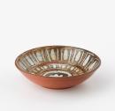 Red body, white glaze in interior, wax resist decoration of ovals, lines, dots and central rosette under greenish/black slip.