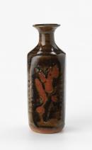 Thrown and beaten to square shape, wide flaring neck, brown syeuite glaze with wax-resist decoration on one side.