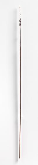 Double ancestor figure carved at the top below the band. The shaft is of bamboo with wooden head attached by fine plaited cane. The head is tipped with bone. The barbed head is a panel running around the arrow of finely incised double ancestor figures. Traces of lime or white pigment.