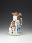 Toby Jug, seated figure holding tankard and keg between feet, painted in blue and brown mottled colours.