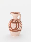 Unglazed buff-coloured body, design of lines, circles, crosses in iron oxide pigment, brown rim, stopper.