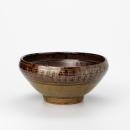 Buff-coloured body, olive-green glaze, black slip with decoration of incised lines on upper inside and out.