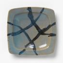 Press-moulded square shape with deep well in centre, bluish-grey glaze with trailed cobalt decoration