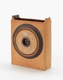 Slab-built with two ends projecting above the longer sides, reddish-orange unglazed body, interior with tenmoku glaze, one side heavily lined and coloured with pigment, the other with circular panel in high relief with deep tenmoku-glazed hole in centre surrounded by concentric rings either painted deep brown or with white slip.