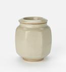 Cylindrical shape cut into seven vertical facets, pale celadon glaze, the lid overlaps the rip of the jar and has a deep undercut well in centre which serves as a handle.