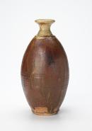 Tall ovoid shape rising to a small neck and flaring out to a wide, flat rim, pale yellowish-green glaze on neck, body of pot has dark tenmoku-type glaze blotched and with darker areas running down to the foot rim.