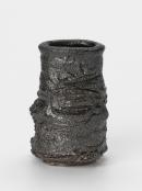 Rougly cylindrical in shape but slightly flattened and beaten near the top to form a square, dark-grey salt-glaze with clay added to basic thrown shape and incised decoration.