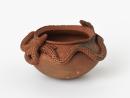Handmade clay pot with rounded base, hemispherical body tapering slightly at the short neck and everted lip which is decorated with deep solid lines. Two serpents wrap around just below the neck with their heads resting on opposite ends of the rim. Decorations of dots.