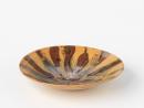 Greyish body, straight sides flaring out from foot, yellowish glaze with splashes of dark brown and black glaze which radiate from centre of bowl, three incised lines around exterior of bowl to the rim.