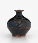 Flattened spherical shape, short neck and wide flat rim, tenmoku glaze with restrained iron brush decoration, once fired at 1350°C.