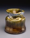 Squat shape, the bottom part cylindrical and slightly waisted, the upper third squashed down and manipulated into a square, glaze of brown and green intermingling with blue glaze with, at one point, runs to the bottom of the pot
