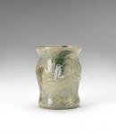 Cylindrical shape, slight bulge at middle, decoration of tree whose branches encircle the pot, tree has oversized leaves and perched on the branches are two kookaburras and a koala, the background is carved away to leave the decoration in relief, thin grey-blue glaze with touches of blue and green