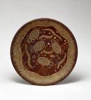 Flat plate, enclosed by a wavy circular line is a design of four turtles among waterweeks, the outside of the plate has a hatched design and at the rim a continuous chevron design, the whole design incised through a brown slip into the buff-coloured clay.