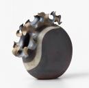 Flattened spherical form with large opening on one side extending from the top of the pot around one quarter, the opening surrounded on all sides by elaborate, symmetrical curls of thinly rolled clay, white clay slip painted in broad band around the opening and the curls.