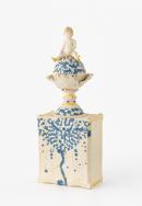 A doll-like figure of a child seated on a globe. The globe set in four crimped petals mounted on a "turned" pedestal base. The deep rectangular base with carved and canted corners. The white body decorated with blue and white marquetry inlays, stamped motifs, gilt and yellow-painted details, and applied pads.