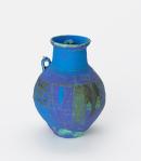 Tapering, ovoid body with a high, vertical neck and an everted lip. A small lug handle at the junction of the neck and body; the lid, with three-pronged handle, sunk deep in the neck. The surface predominantly vivid blue (matt), with incised and combed decoration.