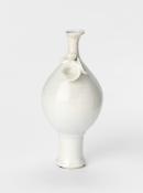 Globular body raised on a wide foot, with a tall, narrow neck terminating in an everted lip. Three flower shapes attached to the side.