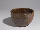 Deep bowl with gently curved, almost vertical sides. The interior glazed, the exterior with a wide bib of glaze on one side.