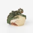 A cracked, cream-coloured egg from which a green and brown dragon has emerged. The dragon sits upon the egg.