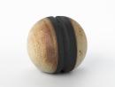 Spherical form with a deep vertical groove around the centre, and with five apertures at the top. The groove and its borders rubbed with black, the red of the pot with a creamy glaze mottling to brown.