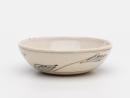 Deep saucer with creamy-white glaze. The interior plain, the exterior painted iwth leaf-like shapes with grey-green outlines fitted in blue brush strokes.