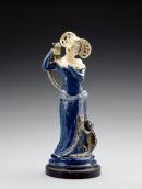 Full length female figure in hip-shot pose, elaborate headdress, blue gown, holds dragon.