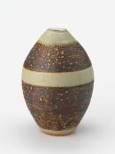 Tall ovoid vase tapered towards the mouth and foot. Decorated with alternating horizontal bnads of pale grey-green glaze and incised, textured clay rubbed with brown pigment.