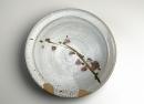 Large bowl with slight-everted rim. The crackled matt grey-white ground of the interior is painted in green and mauve with a sprig of blossom.