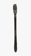 Snake on handle topped with two additional figures squatting in profile. Extended 's' top. Incised patterns heightened with lime.