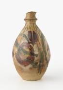 Tall ovoid body with high, ridged neck and irregular rim; with brown, ochre, green and buff glazes in trails and broad, sweeping brushstrokes.
