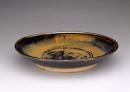 Circular platter with tenmoku and ochre glazes with central panel with brush decoration.