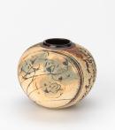 Ovoid vase, rounded, dark-glazed rim and tapering to flat base, oval panels sides brush decoration.