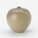 Ovoid jar tapering at the base with sligthly raised ridge at the shoulder and the lid with partly recessed handle; the outer surfaces with olive green salt glaze.