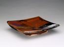 Square, concave surface decorated poured glazes of red/brown, black, pale grey, on square plinth.