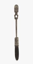 Standing scrollwork (human) figure facing forward. Incised patterns are heightened with lime.
