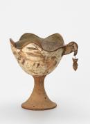 Deep bowl with wavy rim and applied bird's head with pendant fish; set on an inverted trumpet stem; the interior with pink, pale green and brown glazes; the exterior with dry white surface with figurative sgraffito decoration.