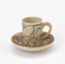 Cup with straight sides and shallow saucer decorated in black and reddish brown with Aboriginal motifs.