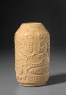 Cylindrical body tapering at neck, buff colour clay, carved all over with Aboriginal-type design.