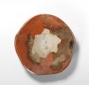 Large platter of asymmetric form on three small feet, with salt glaze of reddish brown colour with splashes of lighter glazes and areas of crackle.