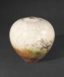 Ovoid jar tapering to a narrow base with recessed circular lid; the creamy glaze extensively crackled and with areas of colour and patches of lustre.