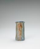 Cylindrical vase with pale blue glaze and modelled with a single, centrally-placed gum leaf.