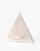 Ceramic of triangular form with rough texture and generally bleached appearance with areas of pale colour and pencil markings.