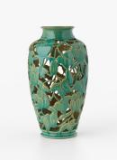 Tall vase with everted rim and tapering to a narrow base, carved and pierced throughout with floral motifs; with turquoise glaze.