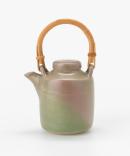 The teapot with cylindrical body and small spout placed high on the shoulder, near two loops which take the cane handle; with pale celadon glaze.