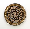 Large circular platter decorated in gold and black with an outer border of knotting and a central motif of curvilinear interwoven bands and dots, the design sand blasted in relief against a buff ground.