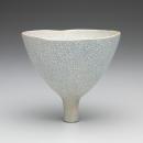 Small bowl of inverted conical shape set on a high and narrower stem, with matt off-white ground and blue crackle throughout.