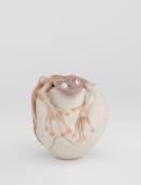 Frog Pot, pod-like in two sections with wavy division, modelled frog clinging to upper section.