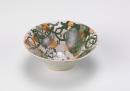 The bowl tapering sharly to a flat, narrow base; the exterior with green glaze; the interior with painted decoration of abstract motifs.